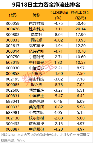 60股主力资金净流出超3亿元,8股净流出金额超10亿元。其中,东方财富、胜宏科技净流出金额分别为50.46亿元、20.14亿元,指南针、同花顺、露笑科技、亿纬锂能、宁德时代、中科曙光等净流出也居前。