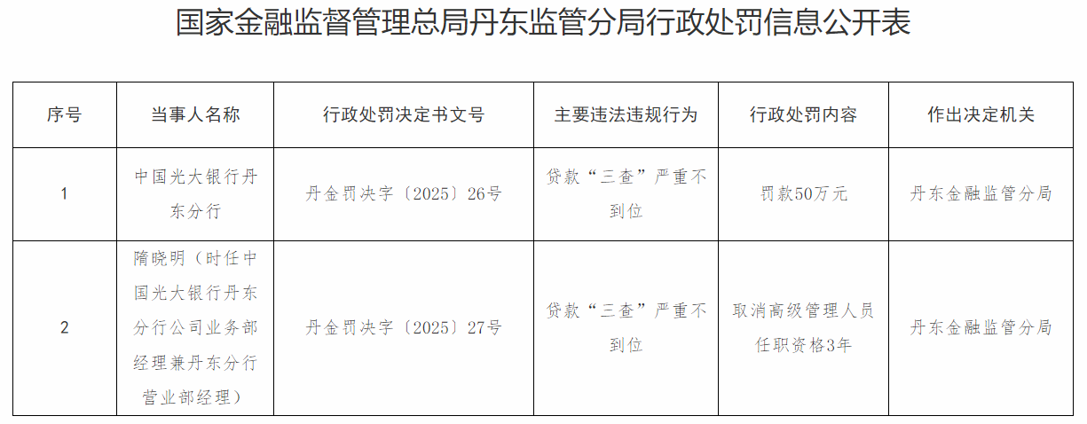 9月28日,国家金融监督管理总局丹东监管分局发布的行政处罚信息显示,因贷款“三查”严重不到位,中国光大银行丹东分行被罚款50万元。隋晓明(时任中国光大银行丹东分行公司业务部经理兼丹东分行营业部经理)被取消高级管理人员任职资格3年。