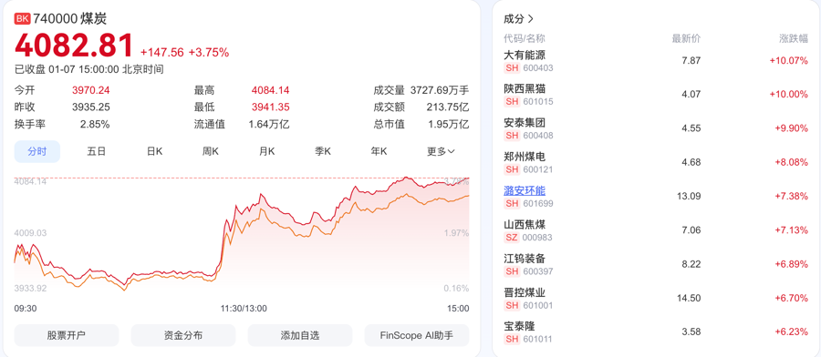 除科技主线外,煤炭板块午后强势拉升,表现抢眼。大有能源、陕西黑猫、安泰集团多只个股涨停。催化因素来自期货市场,焦炭主力合约触及涨停,报1773元/吨。表明期货市场短期内看好焦炭价格会继续上涨,也直接带动了A股煤炭股票大涨。