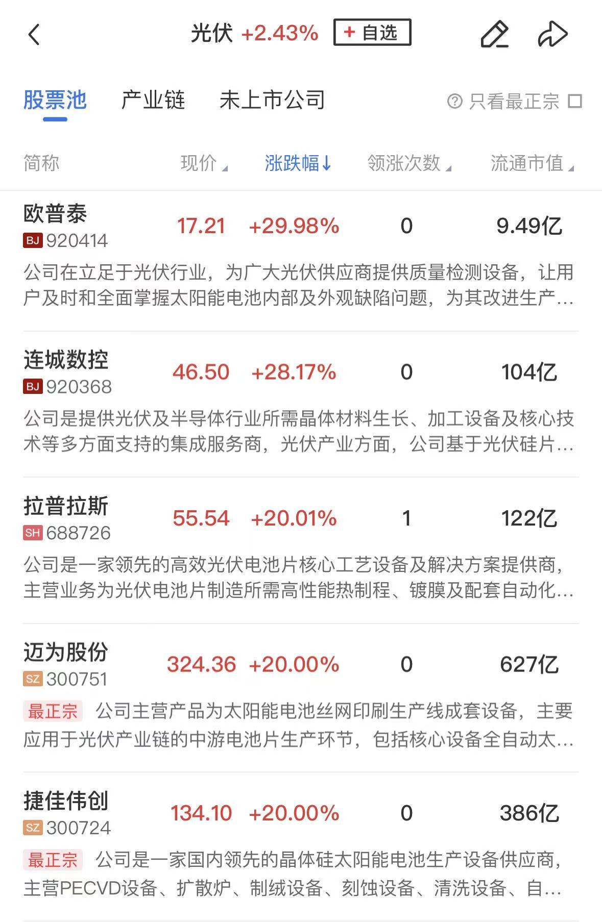 光伏设备方向同样涨幅居前,欧普泰、迈为股份、捷佳伟创、东方日升、奥特维、钧达股份涨停,晶盛机电、艾能聚、禾迈股份、隆基绿能等个股涨幅居前。