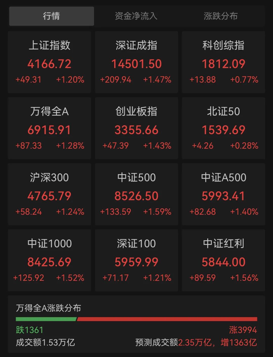 A股市场今天上午整体上行,主要指数大幅上涨,截至中午收盘,上证指数上涨1.2%,深证成指上涨1.47%,创业板指上涨1.43%,科创综指上涨0.77%。