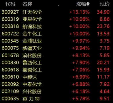 具体来看,化学原料板块涨幅居前,江天化学涨超13%,亚星化学、航锦科技、金牛化工、金浦钛业等股涨停。