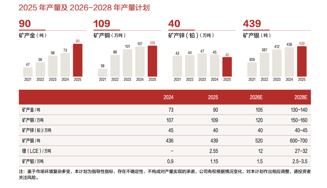 根据公司规划,2026年产量仍将保持高速增长:矿产金105吨、矿产铜120万吨、当量碳酸锂12万吨、矿产银520吨。