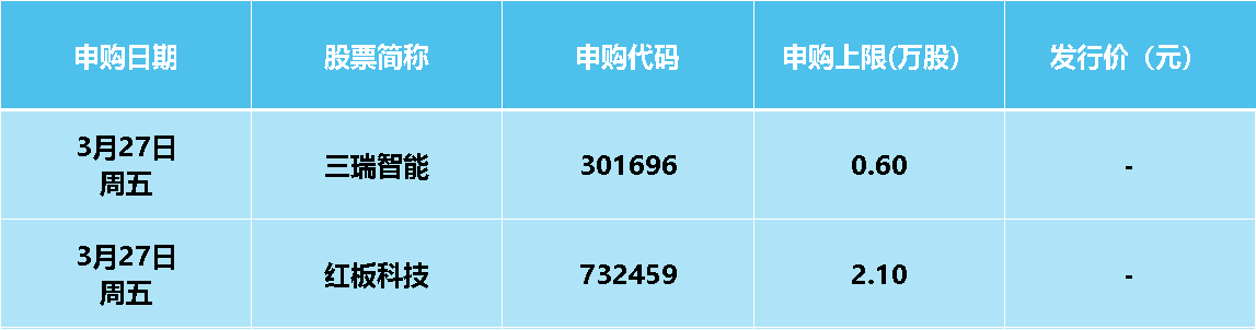 本周(3月23日至3月29日),沪深两市共有2只新股申购。其中沪市主板1只、创业板1只。